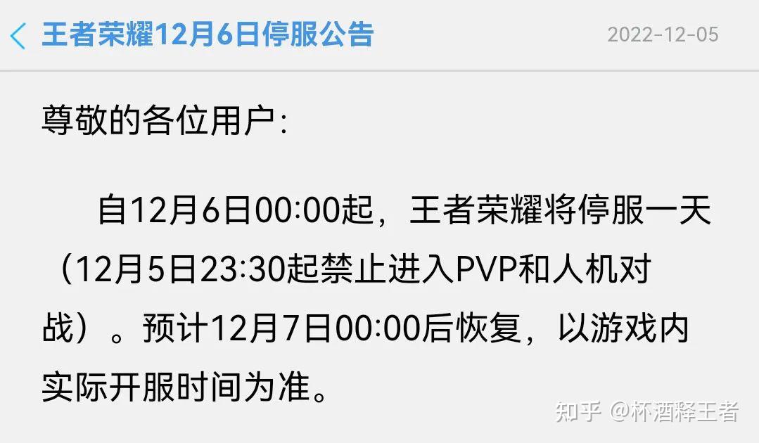 你好,我是小酒。跟预计的一样,王者荣耀将在12月6号停服一天,公告已出。其实,不仅仅是王者荣耀会停服一天,所有的网络游戏都会在这一天停服一天。具体的时间是5号晚上23点30分就禁止PVP模式了。具体恢复时间,暂定是7号的0点。