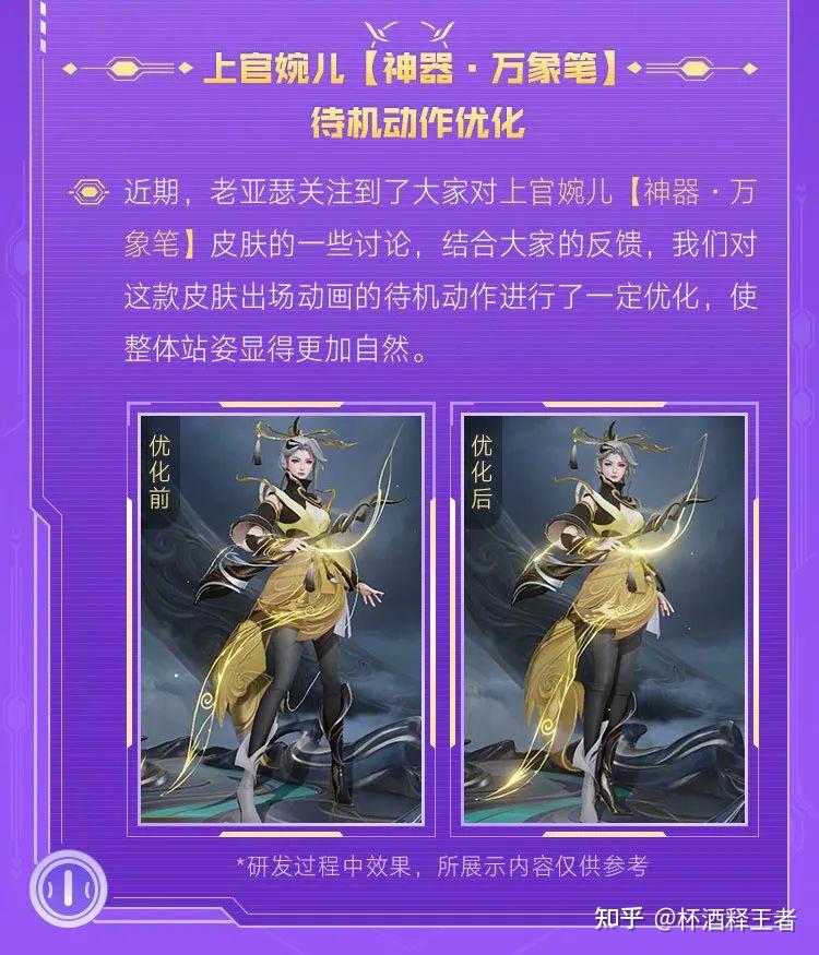 很久没有看到皮肤优化曝光了,没想到前段时间上线的上官婉儿的神器万象笔居然迎来了一波小优化。优化的内容不多,仅有一个待机动作的改动。具体的修改是站姿的改动。或许这个站姿有点不符合上官婉儿原本的形象吧。不过一般玩家也不会在意这种东西。只有刻意去关注,可能才会关注到。