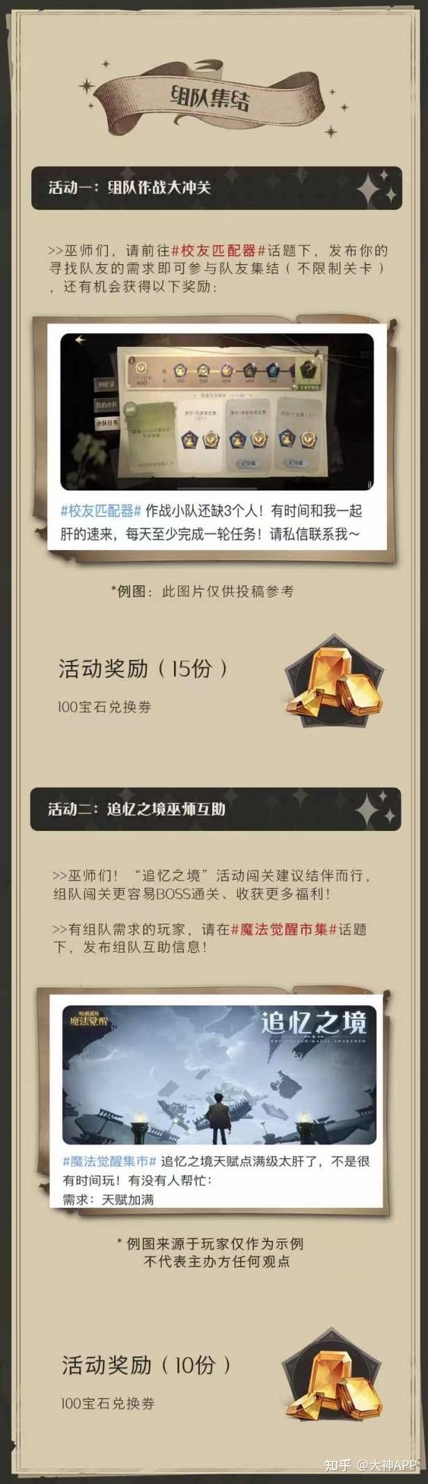 活动期间,登录大神APP进入《哈利波特:魔法觉醒》圈子,在#校友匹配器#话题下,发布你的寻找队友需求即可参与队友集结(不限关卡),或在#魔法觉醒市集#发布“追忆之境”活动组队互助信息,即有机会获得宝石兑换券!快上大神圈子寻找你的作战伙伴,一起冲击更高奖励吧!