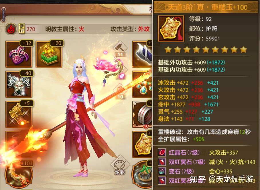 明教自身恐怖的输出能力是来自伤害溢出从而跨属性。跨属性的伤害是副属性伤害为75%的主属性伤害加上。因为这一特性,明教甚至不需要减抗,根本就无法针对。到了后期加上龙纹伤害和内功,伤害更是上了一个层次。而且跨属性不会考虑属性是什么,就算你的主属性是玄属性,伤害占比是不会变的。另外也可以走双属性,伤害计算没有差别,伤害溢出真是可怕。