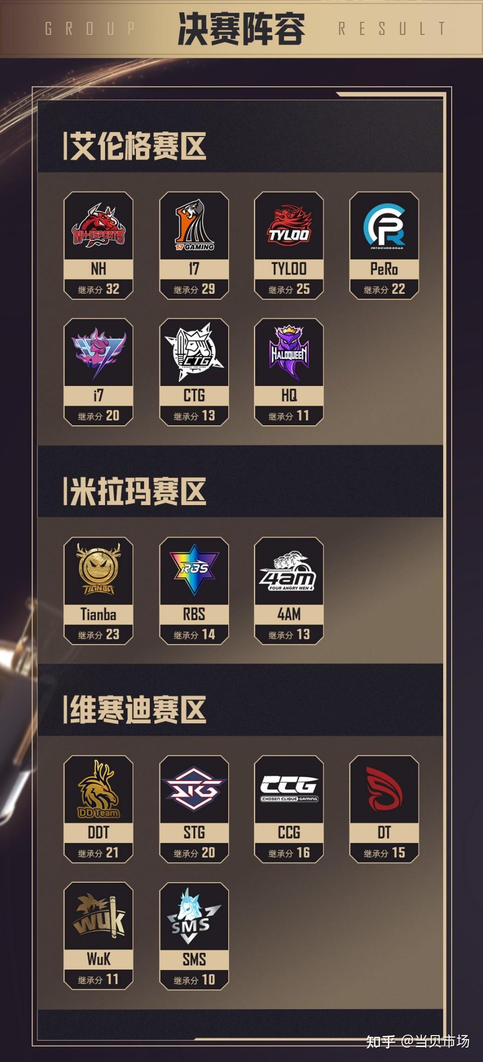 艾伦格赛区7支(NH,17,Tyloo,PeRo,i7,CTG,HQ),米拉玛赛区3支(Tianba,RBS,4AM),维寒迪赛区6支(DDT,STG,CCG,DT,Wuk,SMS)